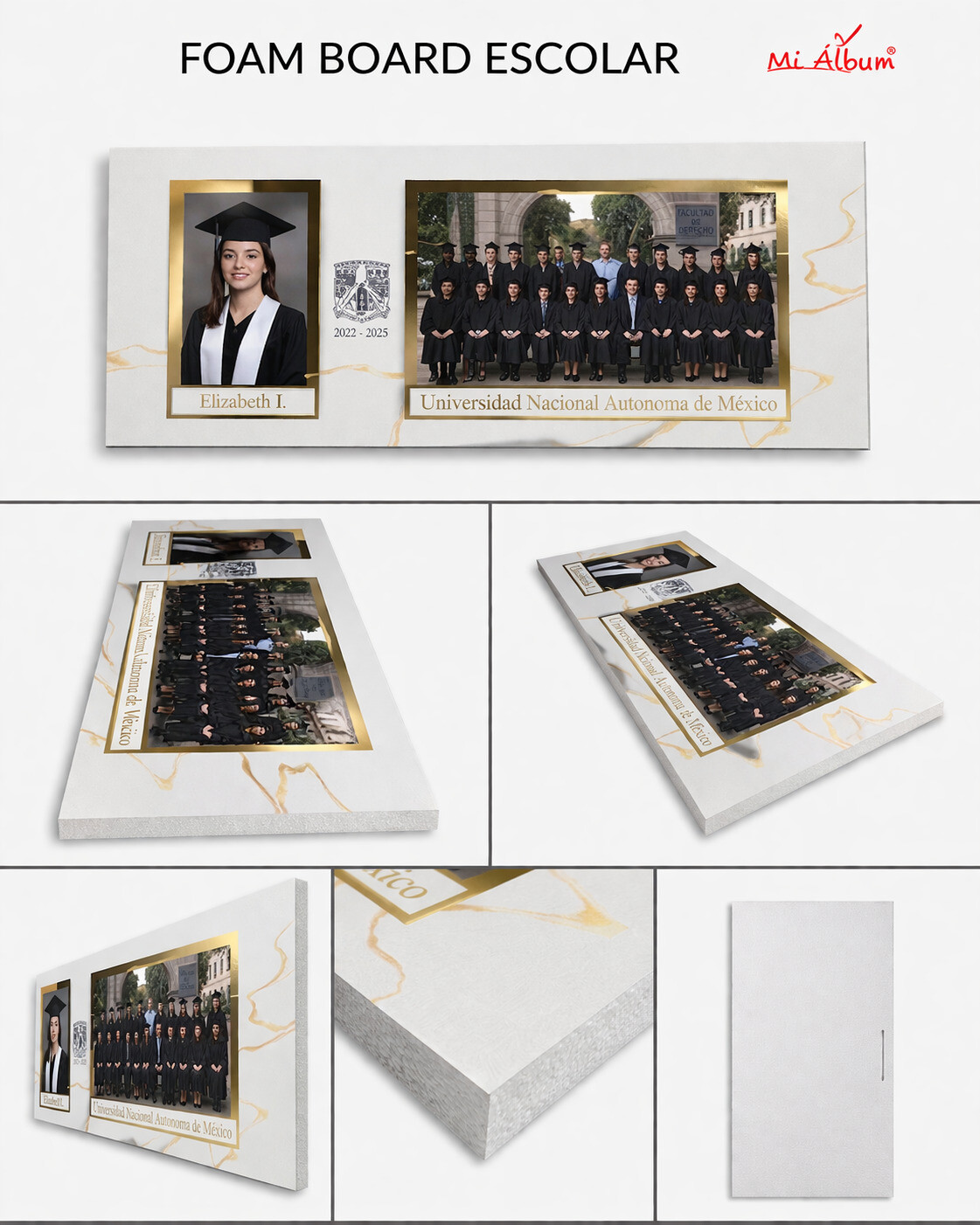 Montaje ligero y práctico para proyectos escolares y exposiciones. El foam board de 5 mm combina una estructura rígida con bajo peso, permitiendo trabajar de forma rápida y económica. La fotografía se monta con laminado en frío con textura, protegiendo la imagen y mejorando su presentación. Es una opción ideal cuando necesitas volumen, rapidez y facilidad de manejo sin complicaciones.