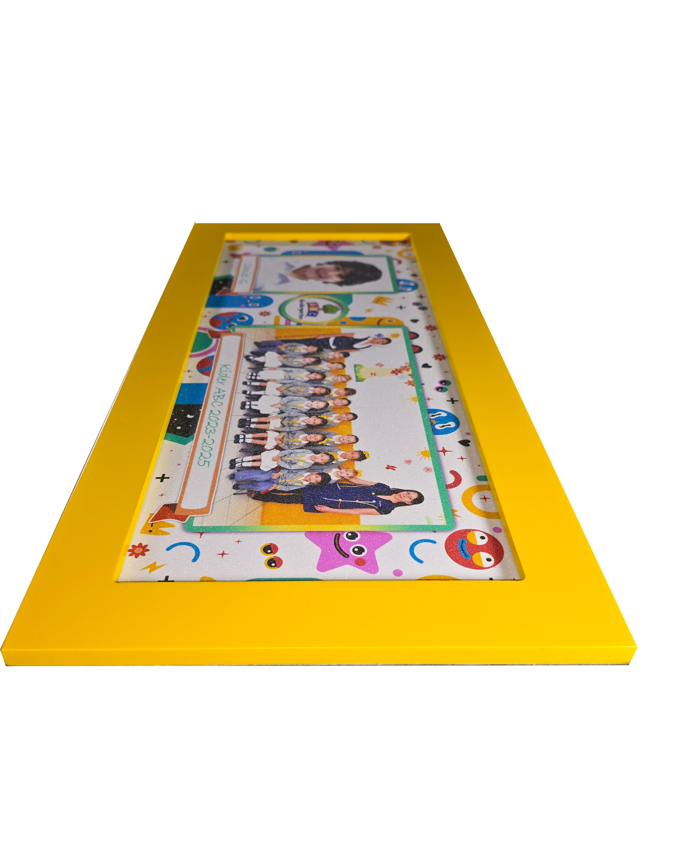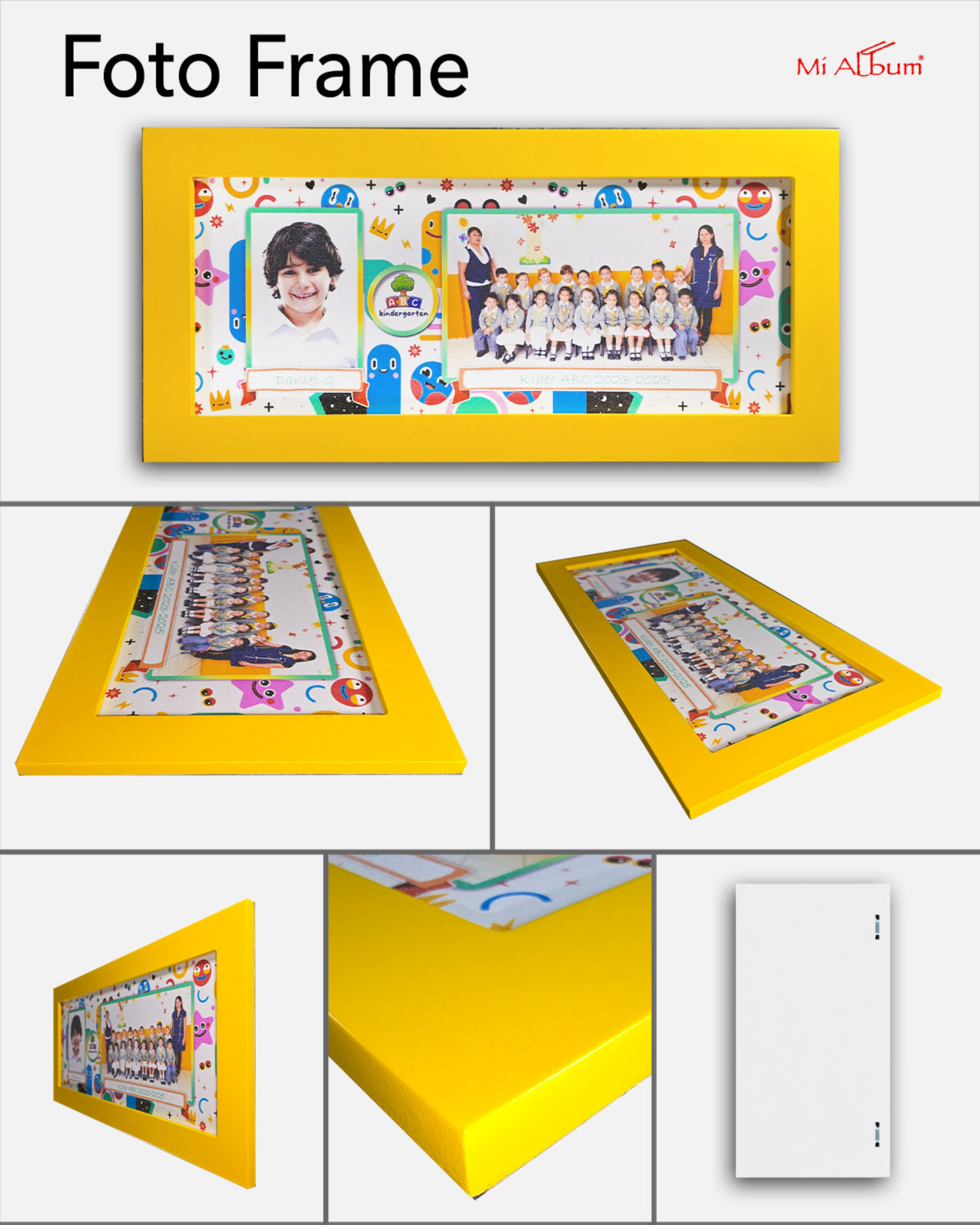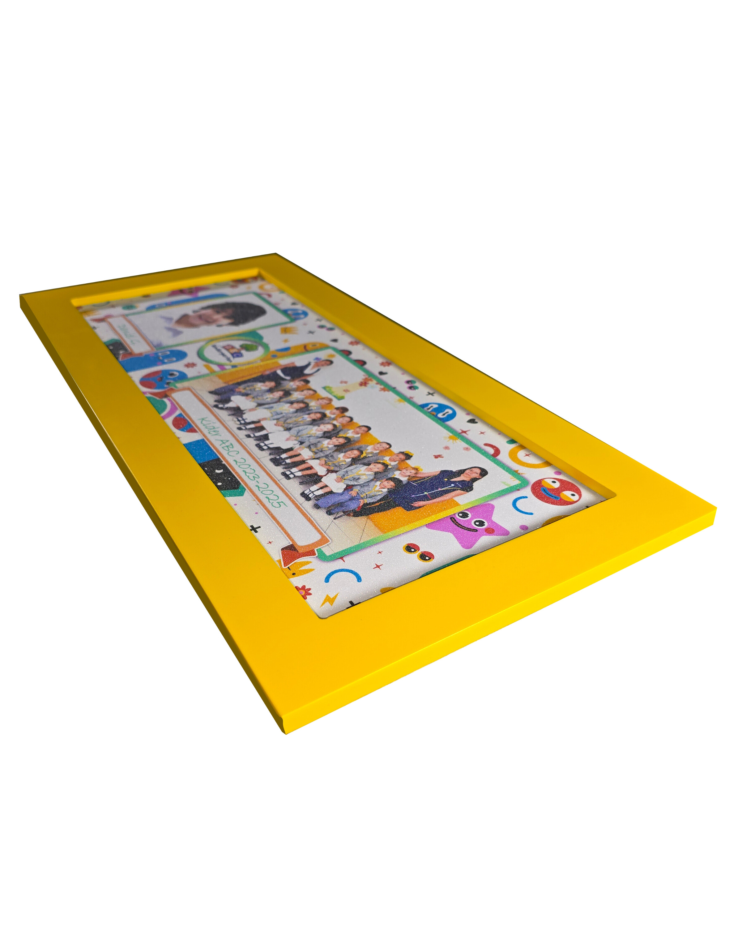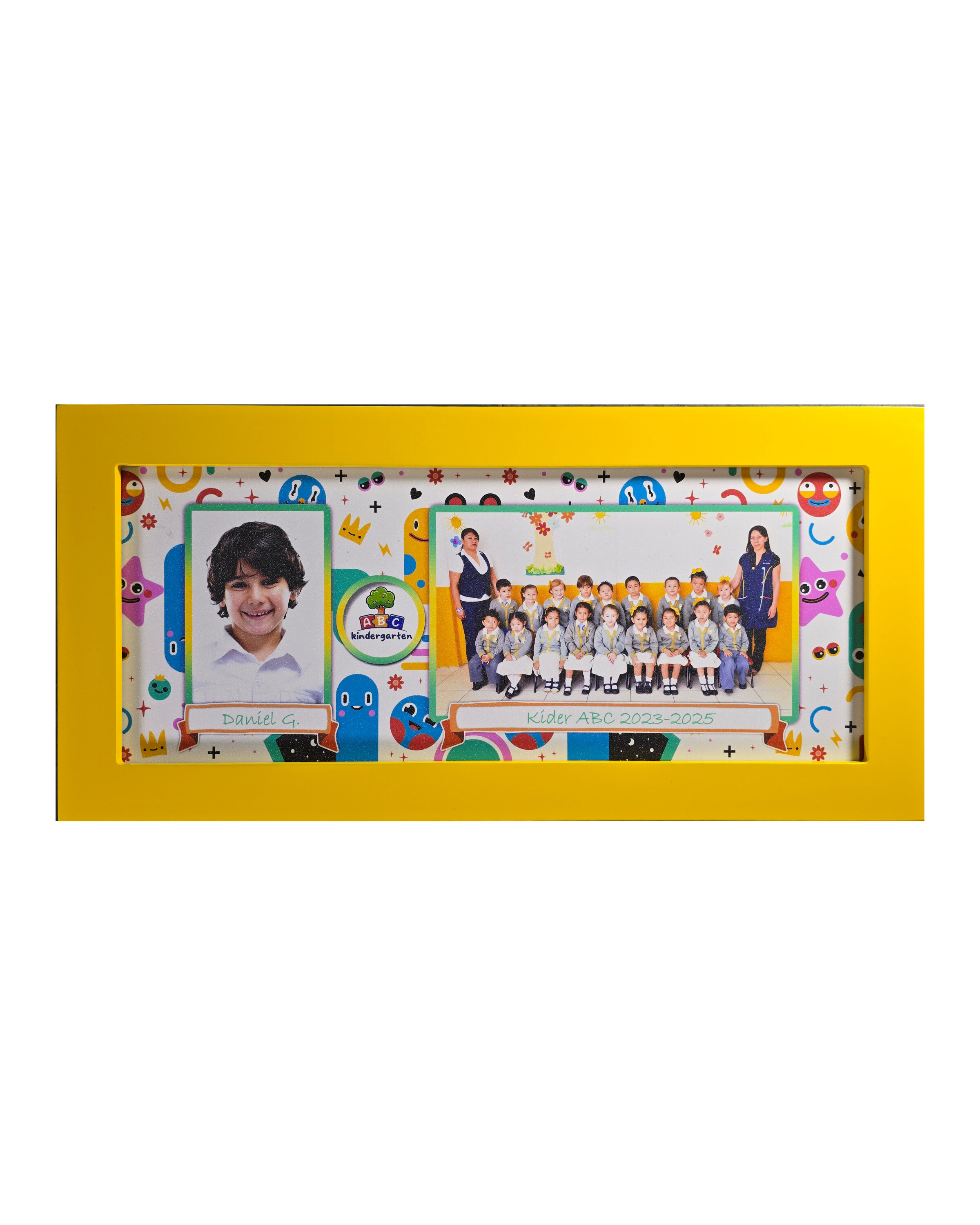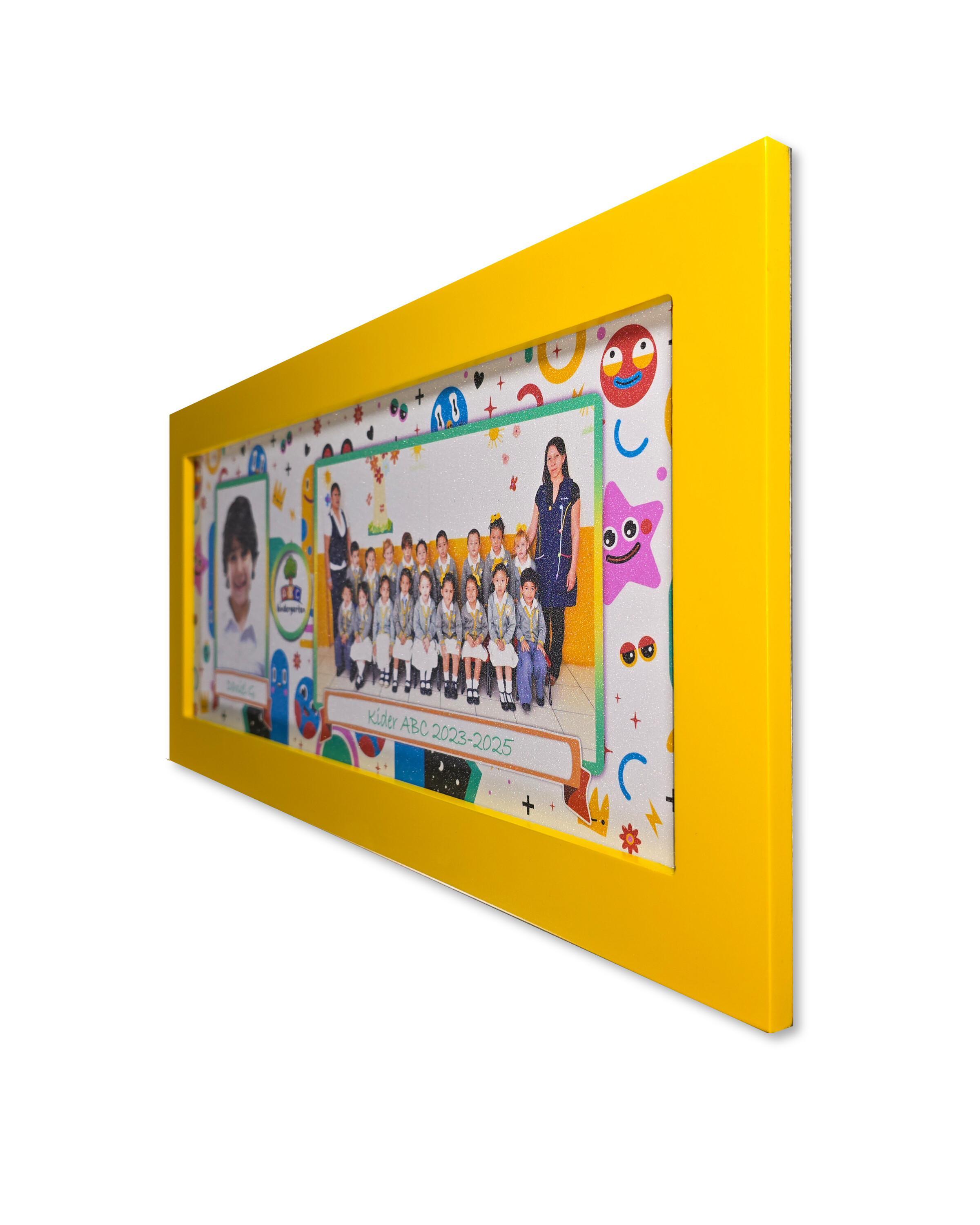Marco fotográfico con diseño limpio y moderno que resalta la imagen sin distracciones. Fabricado en MDF y disponible en varios colores, permite adaptarse fácilmente a distintos estilos escolares. La fotografía se imprime en papel fotográfico real y se protege con laminado en frío con textura, logrando una presentación duradera, elegante y fácil de manejar en producción por volumen.