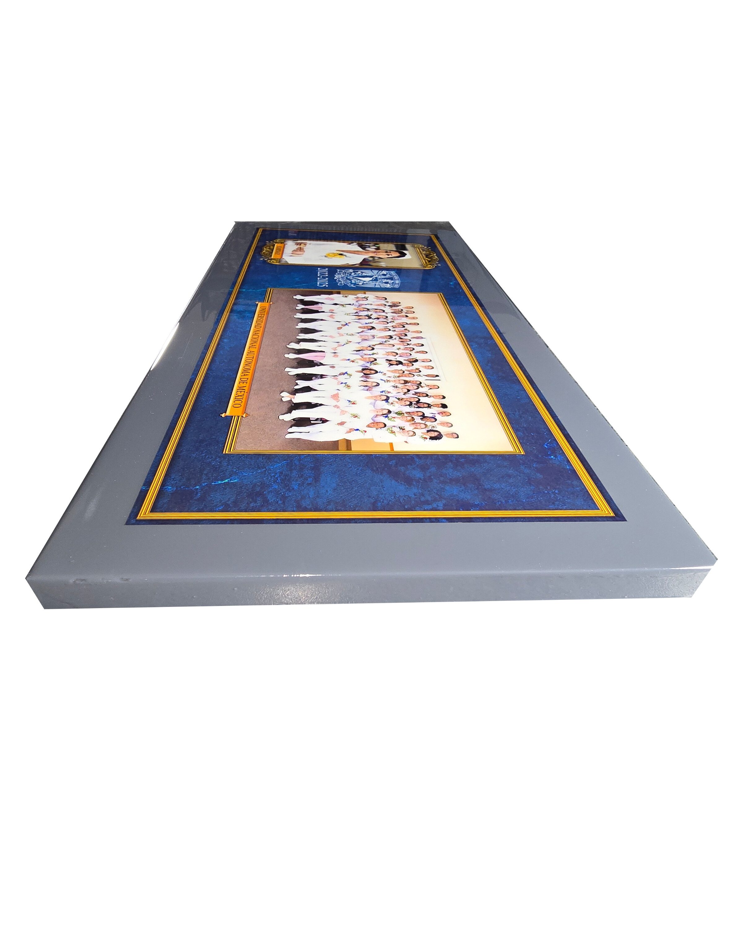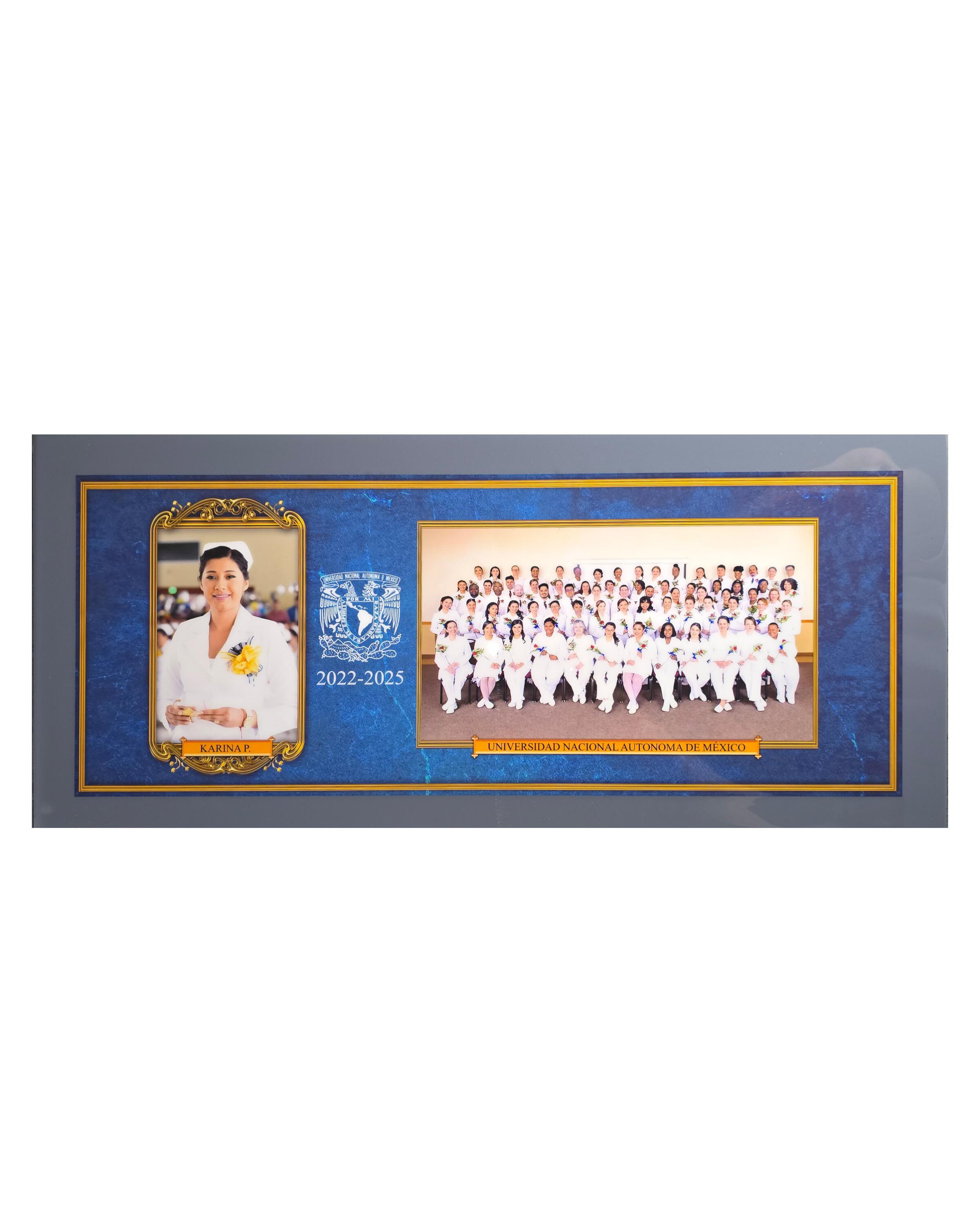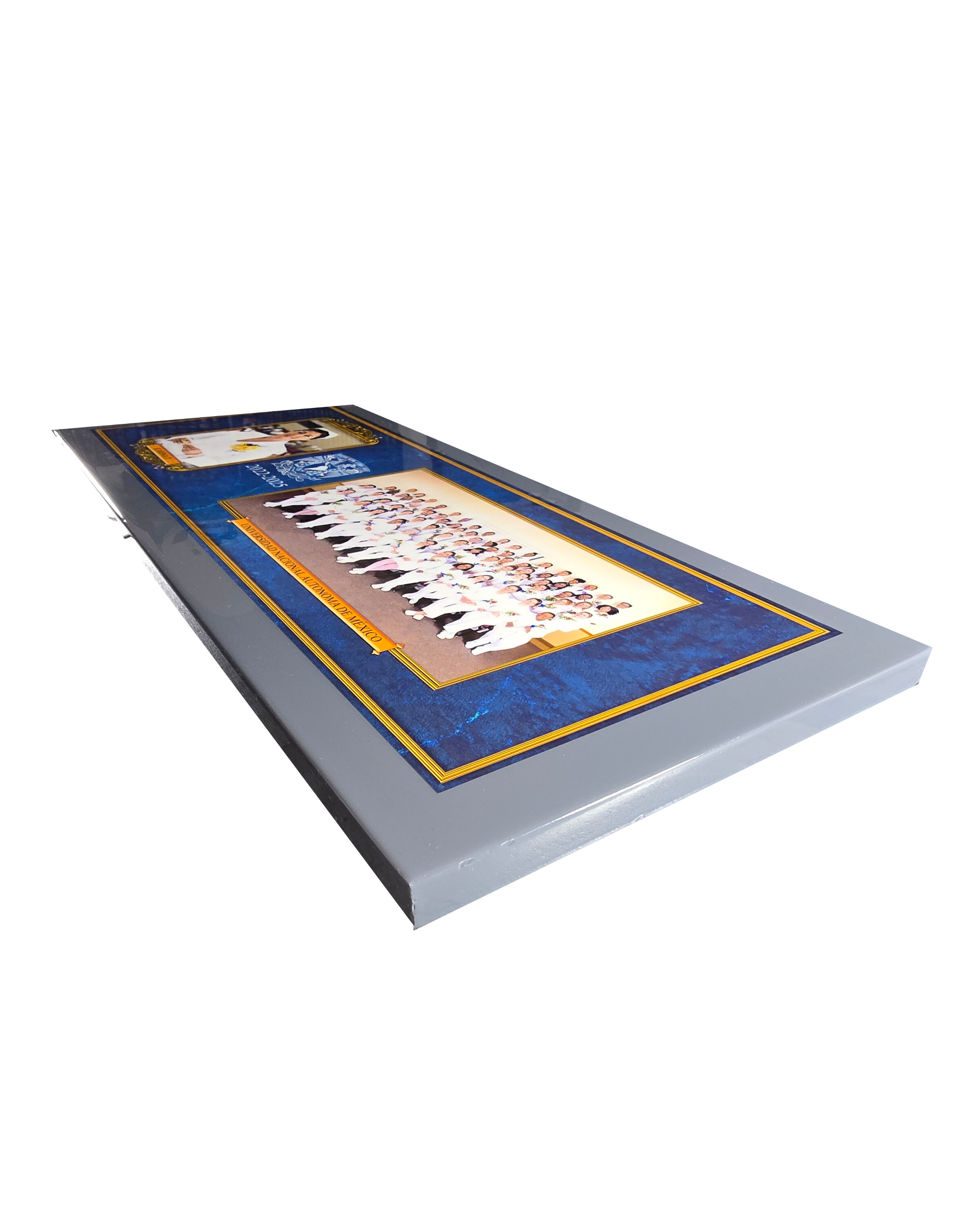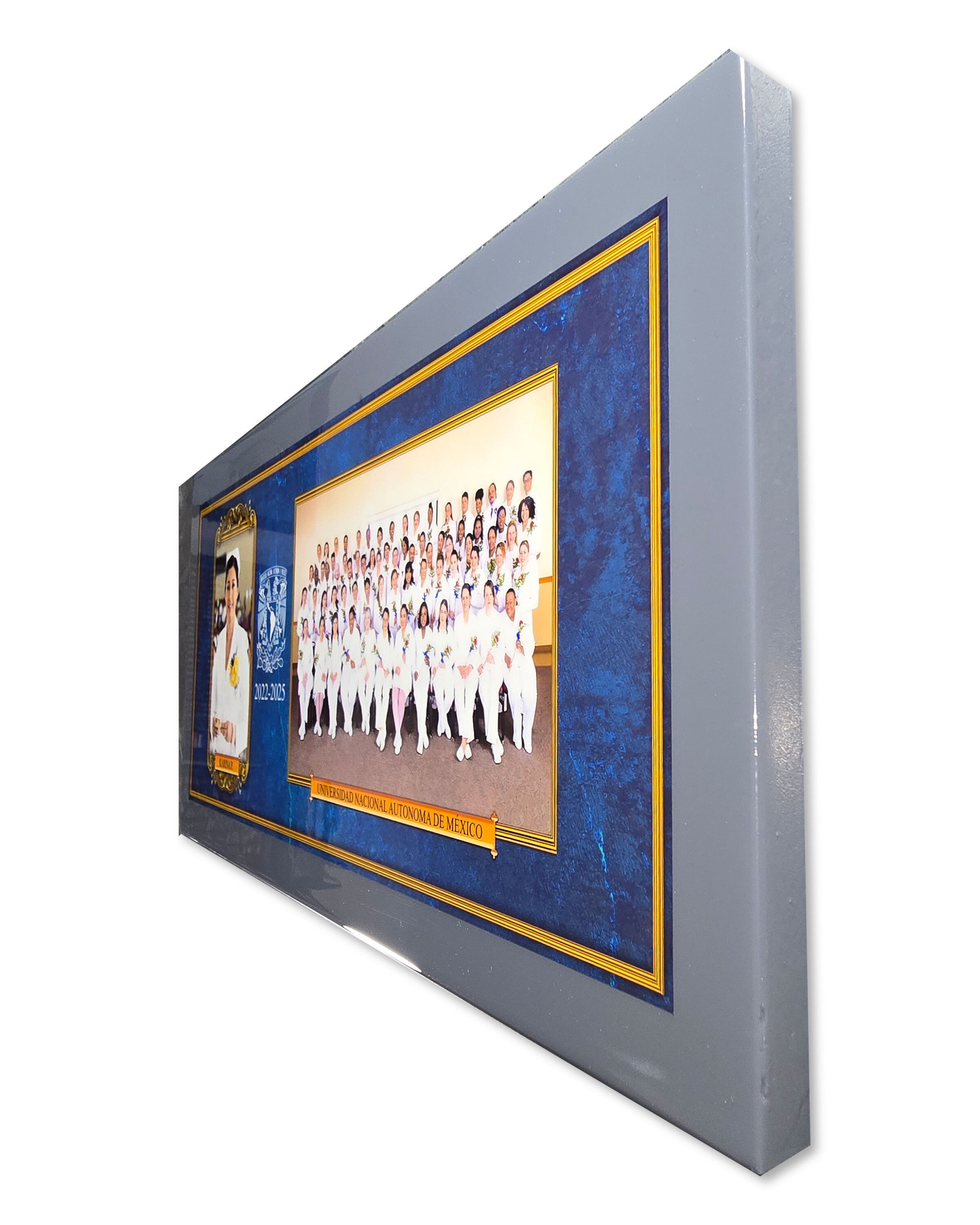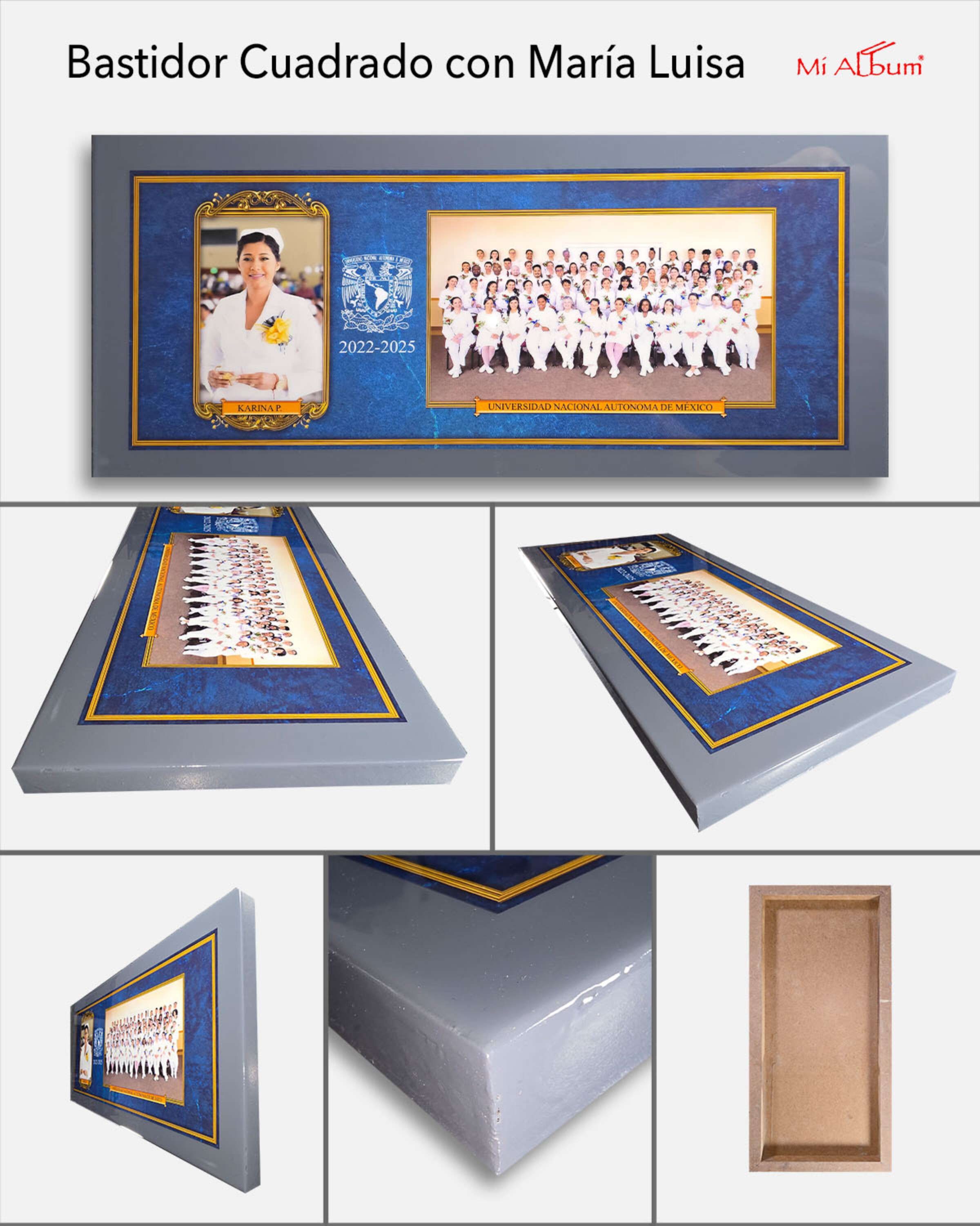 Bastidor cuadrado con margen tipo María Luisa que aporta mayor profundidad y elegancia a la imagen. Su diseño limpio permite resaltar la fotografía central, creando una presentación más estructurada y atractiva. Puedes personalizar colores y elegir entre textura para producción más rápida o poliéster para un acabado brillante. Es una excelente opción para proyectos escolares que buscan una presentación más cuidada y con mayor presencia.